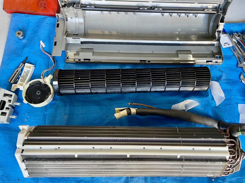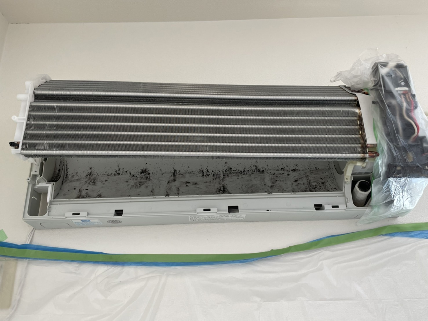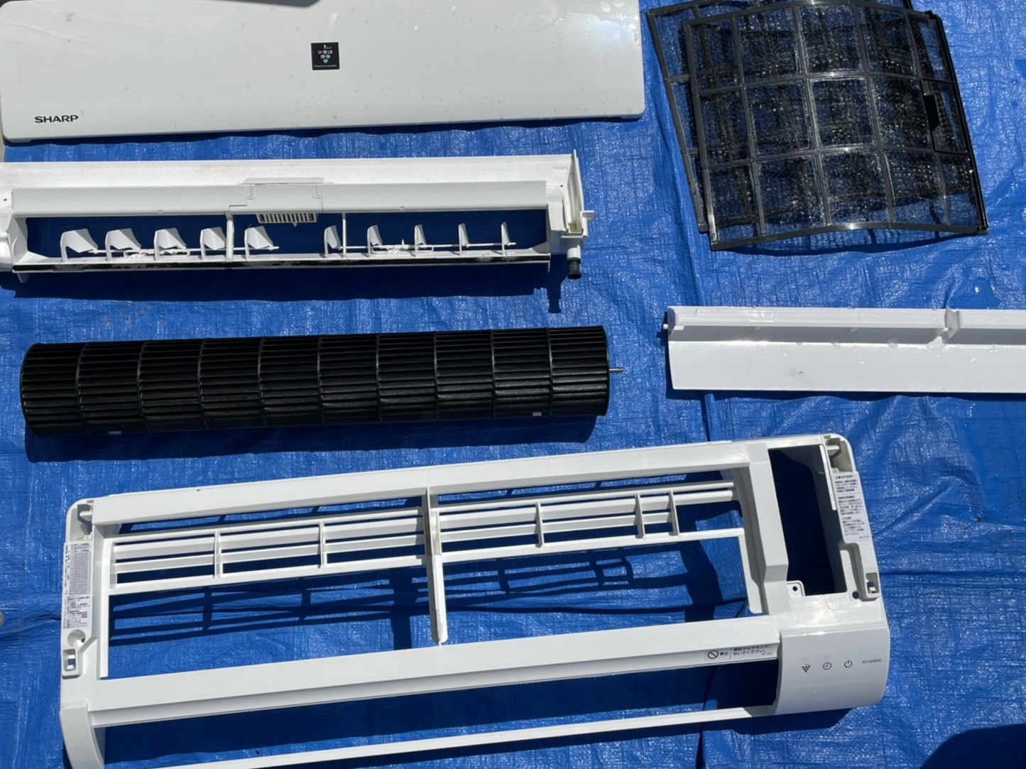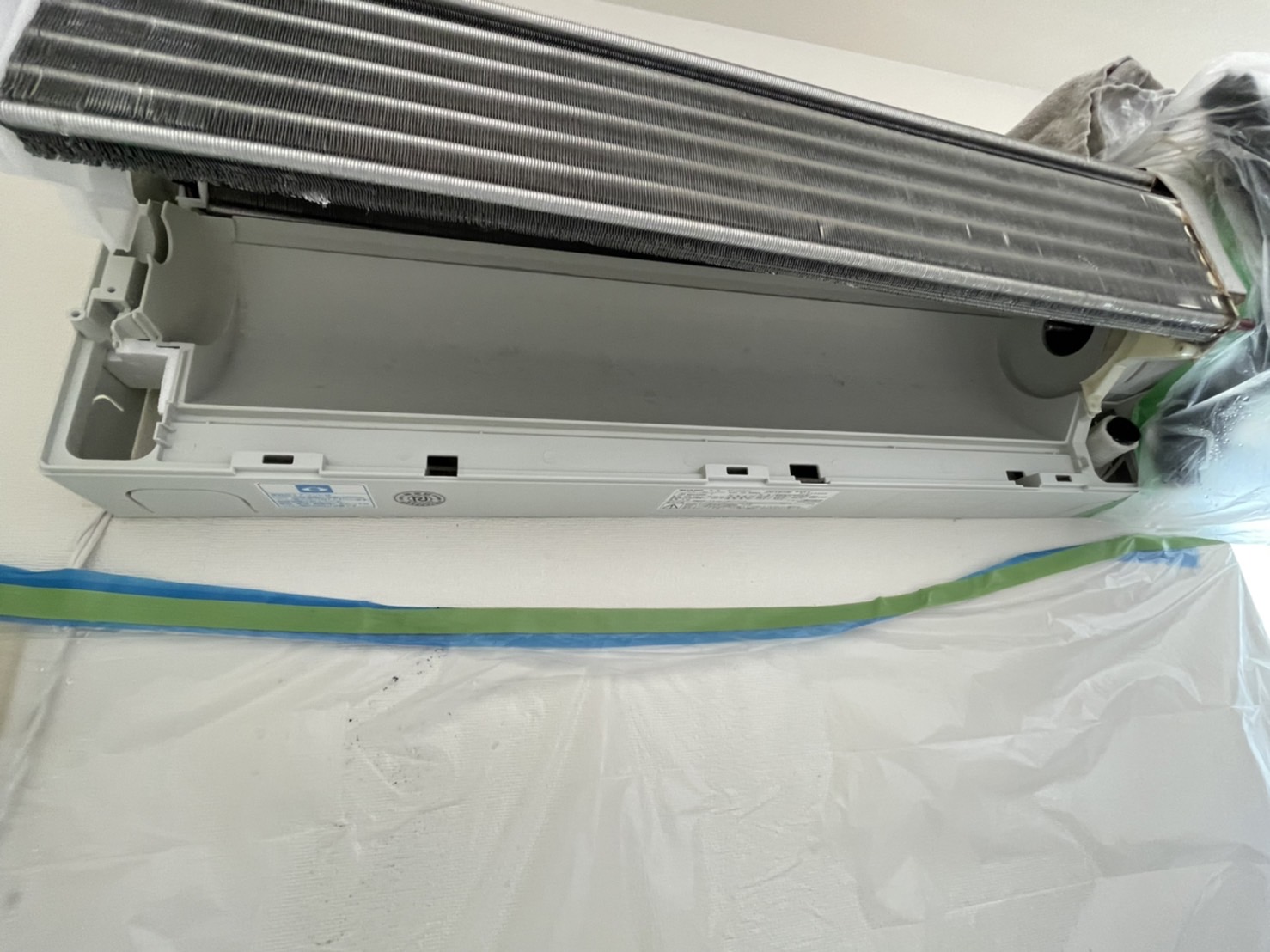 本体カバーやフィルターなどの部品を取り外します。オプション内容によってはドレンパンや送風ファンの取り外しも行います。