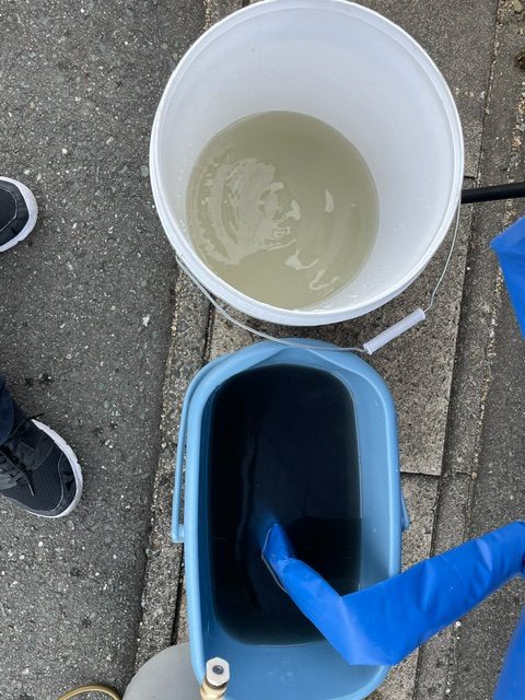 こちらがエアコンの汚れのお水になります上はアルミフィンで下の黒い汚れが送風ファンの汚れになります