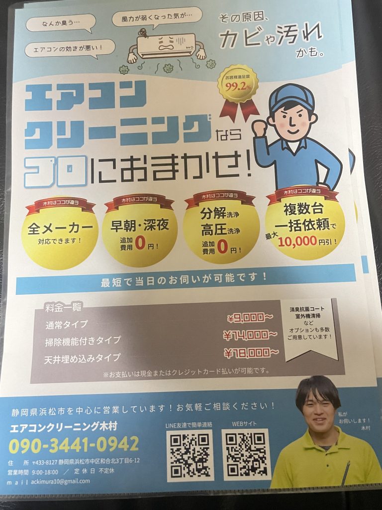 チラシも枚数が減ってきましたー 浜松や遠方も対応してますよ!🔥エアコンクリーニング是非お問い合わせ下さい、最短で行けますー!🙌